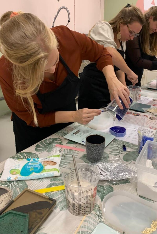Jesmonite is een gipscomposiet zonder schadelijke stoffen. Je hebt voor het werken met Jesmonite geen bescherming nodig. Daarom is deze workshop ook geschikt voor alle leeftijden, knoeien en morsen mag! Jesmonite heeft twee componenten, een vloeistof en een poeder dat je gemakkelijk mengt met een spatel. Het materiaal heeft een korte verwerkingstijd, in ongeveer 35 minuten kun je jouw product al uit de mal halen om het vervolgens verder te bewerken. .